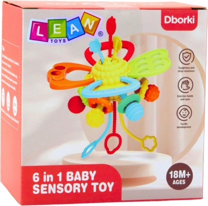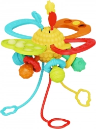 Dit multifunctionele speeltje is ontworpen om verschillende zintuigen te prikkelen en spelenderwijs leren te bevorderen. Het bevat beweeglijke koordjes van zachte siliconen, perfect om op te bijten en aan te trekken, wat verlichting biedt bij doorkomende tandjes. Elk koordje heeft een andere kleur en textuur, wat de tastzin en het zicht van het kind stimuleert.