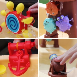 - Rijke uitrusting: piratentoren met figuurtje, waterglijbaan, waterkanon, bellenblazer, anker, roer, bekertjes, drijvende diertjes en meerdere wielen met watereffecten.