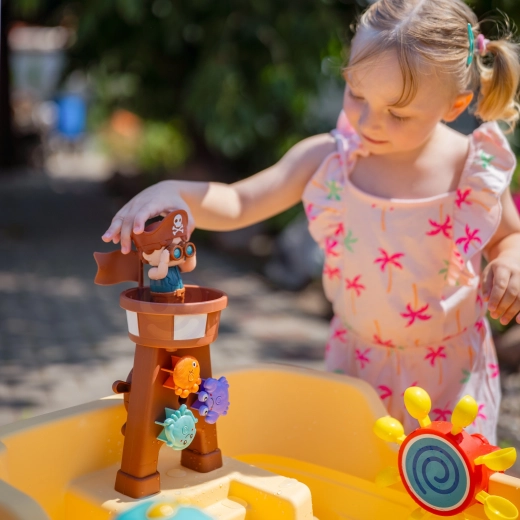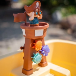 De toren met piraat, het roer, de anker en de waterglijbaan creëren een authentieke piratenwereld. Kinderen gieten water in trechters, laten wielen draaien en zetten waterbanen in beweging.