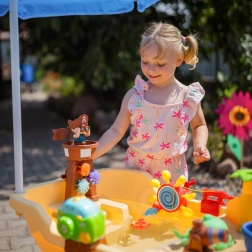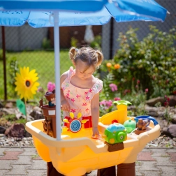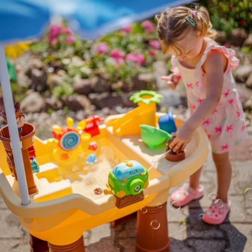 De grote Woopie watertafel in piratenschip-design verandert de tuin in een baai vol ontdekkingen. Kinderen kunnen water gieten, waterwielen laten draaien, met het kanon spuiten, bellen maken en het schip besturen met de piratentoren en het roer. De geïntegreerde zonneparasol biedt schaduw op warme dagen, zodat spelen comfortabel en veilig is.