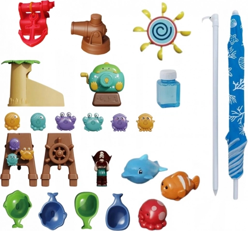 - watertafel, waterkanon, bellenblazer, waterglijbaan, anker, mast met uitkijk, piratenfiguurtje, 6 kleine waterwielen, 1 groot waterwiel, 3 drijvende diertjes, 4 gietbekers, parasol