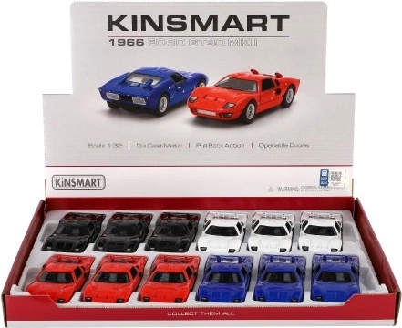 Prachtig metalen modelauto Ford GT40 MKII op een schaal van 1:32. Het autootje heeft openklappende deuren en is voorzien van een trek-en-terug mechanisme, wat interactieve speelpret biedt voor zowel kinderen als verzamelaars.