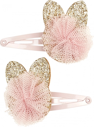 Deze prachtige haarspeldjes zijn bedoeld voor kleine dametjes vanaf 3 jaar. De set bevat twee metalen speldjes met een roze metallic glans, versierd met een gouden katjesapplicatie en aangevuld met een roze tule pompon. Dit subtiele detail zal elke kleine romanticus betoveren. Dankzij het klikmechanisme blijven de speldjes de hele dag stevig in het haar zitten. Ideaal voor dagelijks gebruik en voor speciale gelegenheden.