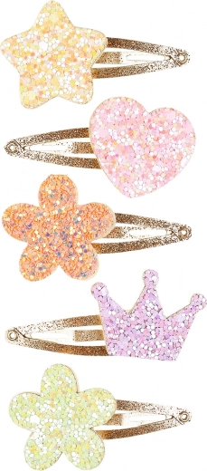 Deze prachtige set haarspeldjes bevat vijf stuks met glinsterende versieringen in de vorm van een ster, hart, bloem en kroon. De speldjes zijn makkelijk te gebruiken dankzij het klikmechanisme, waardoor ze de hele dag goed op hun plek blijven. Ze zijn de ideale haaraccessoire voor ieder meisje.