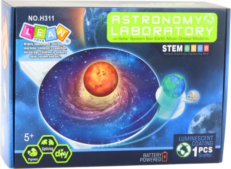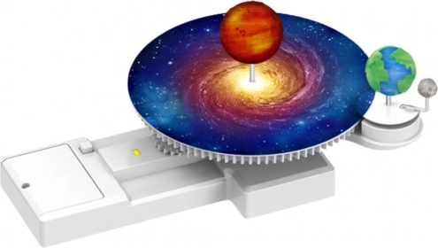 De batterijgevoede set maakt de beweging van de Aarde rond de Zon en de omloop van de Maan rond de Aarde mogelijk. Bevat modellen van hemellichamen, een melkweg, een tandwielmechanisme en artistieke accessoires: kwasten, verf, palet en handleiding. Kinderen kunnen de planeten naar eigen inzicht beschilderen, wat creativiteit en handvaardigheid stimuleert.