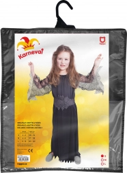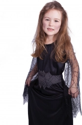 Geweldig kostuum voor kleine heksjes! Zwart kostuum in maat S, ideaal voor meisjes van 4 tot 6 jaar. Ziet er onweerstaanbaar uit dankzij de jurk met transparante mouwen met spinnenwebmotief.