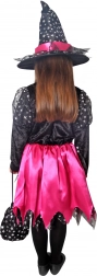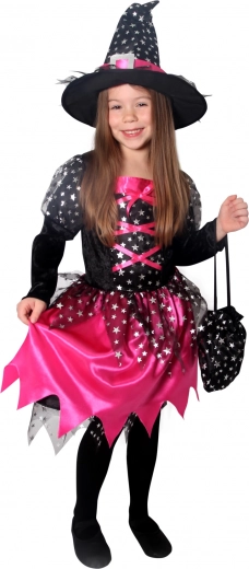 Magisch kostuum voor kleine heksjes! Dit zwart-roze kostuum is ideaal voor meisjes van 4 tot 6 jaar, versierd met roze linten en zilveren sterren.