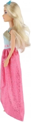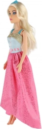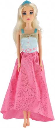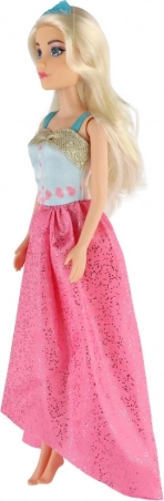 De lange roze rok met glans en het contrasterende blauwe lijfje geven de pop een uitzonderlijke look – ideaal voor een bal of modeshow.