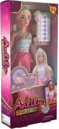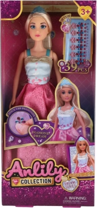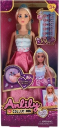De Anlily-pop van 30 cm betovert met een elegante, glinsterende jurk in roze tinten en details in blauw en goud. De stijl wordt aangevuld met een haarband en realistisch ogend lang haar dat uitnodigt om te kammen en kapsels te maken. In de verpakking zitten ook kleine “diamanten” decoraties die het spel een vleugje luxe geven.