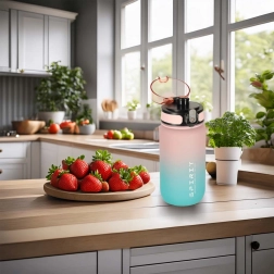 De roze-blauwe waterfles is een praktische accessoire voor wie de waterinname gedurende de dag wil bijhouden. Met behulp van de afgebeelde schaal met infografiek kun je beter controleren hoeveel water je al hebt gedronken en hoeveel je nog moet aanvullen. Het maximale volume is 600 ml, wat het bijhouden van je dagelijkse vochtinname vergemakkelijkt.
