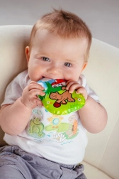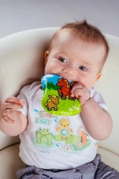 Het kussentje is gemaakt van veilige materialen zonder ftalaten en is gecertificeerd voor kinderen vanaf de geboorte. Er is keuze uit meerdere schattige diermotieven die visuele stimulatie en de eerste herkenning ondersteunen.