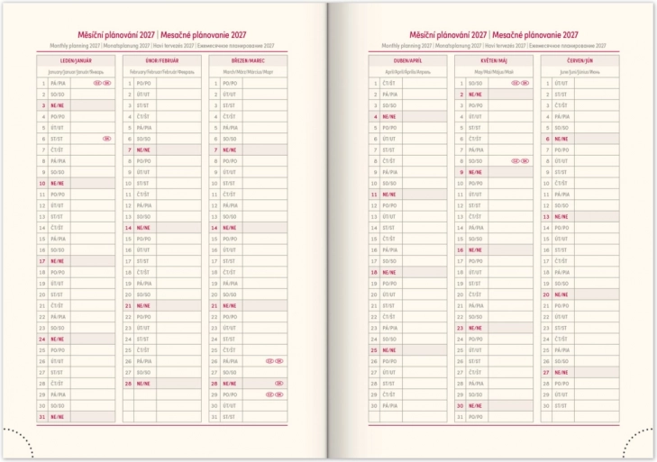 Elegante weekagenda voor 2026 met een uniek design en een uitgebreid meertalig kalendarium, ideaal voor dagelijks plannen.