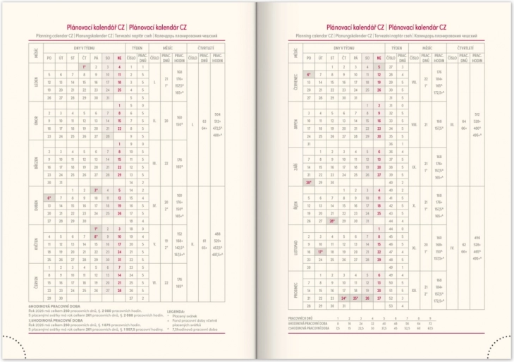Elegante weekagenda met een fijn gestructureerde omslag voor het jaar 2026 en een praktisch weekoverzicht met een Tsjechisch-Slowaakse kalender en meerdere talen.