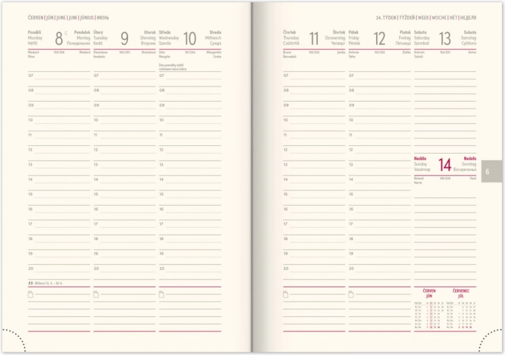 - Weekindeling van de kalender in Tsjechisch-Slowaaks formaat met aanvullende Engels, Duits, Hongaars en Russisch.