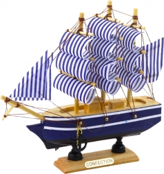 De stijlvolle modelzeilboot met klassieke constructie is ideaal voor iedereen die maritieme esthetiek bewondert. Het traditionele driemasttuig in wit-blauwe strepen en de donkerblauwe romp met witte band creëren een opvallende look. Dankzij de esthetische verhoudingen en de handmatige afwerking valt het model op door verfijnde details en een elegant uiterlijk.