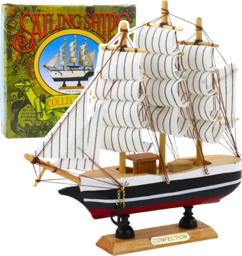 Dit compacte model van een driemaster is een elegante replica van een klassiek vaartuig met een contrasterend ontwerp in zwart, wit en rood. De karakteristieke zeilen met dunne strepen en het realistische touwwerk, samen met de driemasterconstructie, maken het ideaal om tentoon te stellen.