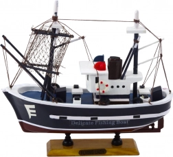 Het model Flying Lady is een decoratieve replica van een klassieke vissersboot, geïnspireerd op schepen die worden gebruikt voor kust- en havenvisserij. Het heeft een kenmerkende opbouw, een hoge kapiteinstoren, een enkele mast met tuigage en technische details die radar en schoorstenen imiteren, wat zorgt voor een unieke, realistische look. Gemaakt van hout en met de hand afgewerkt, wat het een verzamelwaarde en een uitgesproken nautisch karakter geeft.