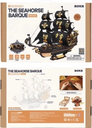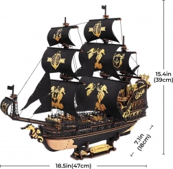 Gedetailleerd model van een oorlogsschip met zwart-gouden zeilen en rijke decoraties. Elk detail is zorgvuldig uitgewerkt om op te vallen en je model een realistische uitstraling te geven.