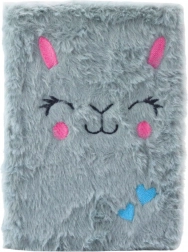 Het pluche schrift in lijnen met een geborduurd motief van een grijs konijntje is een schattig en nuttig product dat meteen opvalt. De zachte, pluchen kaft in gedempt grijs is versierd met een borduursel van een konijntjesgezicht met roze oren en wangen en twee blauwe hartjes, wat een charme en kinderlijk plezier toevoegt aan het product.