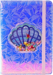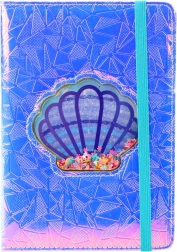 Holografisch gelijnd notitieboek met een decoratieve schelp, perfect voor iedereen die modern stijlgevoel en opvallende papieren accessoires waardeert. De kaft glinstert met een holografisch patroon in tinten roze, paars en blauw, wat de aandacht trekt en een magisch lichteffect creëert.
