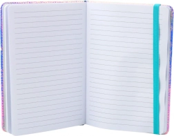 Het midden van de kaft is versierd met een transparante schelp gevuld met confetti in de vorm van bloemen en hartjes, die vrij bewegen bij elke beweging. Het geheel wordt afgewerkt met een elastische band in contrasterende kleur, die het boek gesloten houdt en de pagina’s beschermt tegen kreuken of ongewenst openen.