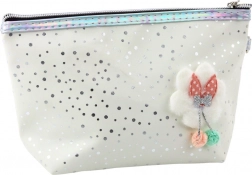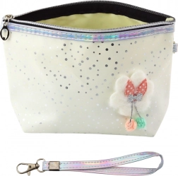 De etui is voorzien van een betrouwbare rits en een comfortabele polslus met karabijnhaak, waardoor je hem eenvoudig aan een rugzak kunt bevestigen of om de pols kunt dragen. Versierd met een zijden strik en een pompon die speelse charme toevoegen; het oppervlak is afgewerkt met glitters die in het licht schitteren en zo een aantrekkelijke en moderne look creëren.