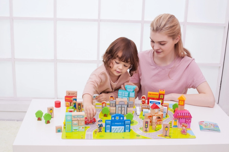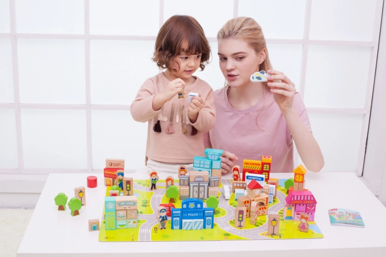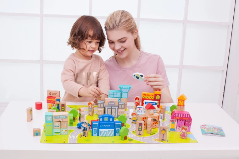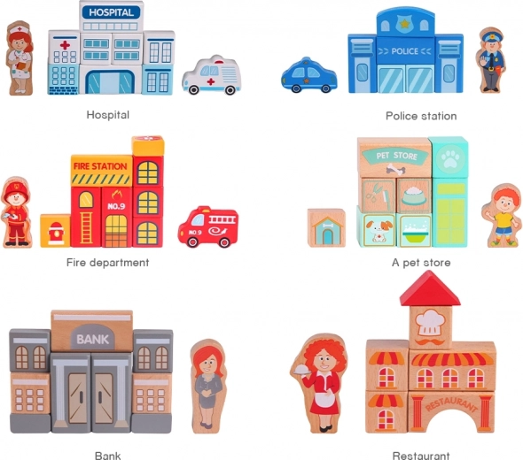 Met deze set kunnen kinderen typische stedelijke gebouwen bouwen zoals een school, politiebureau, brandweerkazerne, luchthaven, ziekenhuis, bank, restaurant, dierenwinkel en meer. Het speelgoed is gemaakt van natuurlijke, biologisch afbreekbare en hypoallergene materialen, wat maximale veiligheid garandeert.
