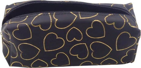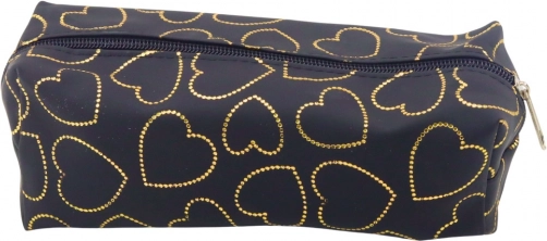 Stijlvol en functioneel etui in elegante zwarte kleur met een subtiel patroon van gouden hartjes, ideaal voor studenten, scholieren en iedereen die praktische accessoires met een modieuze uitstraling waardeert. Dankzij de afmetingen 20 x 8 x 6 cm past het gemakkelijk in een rugzak, tas of bureaulade. Het hoofdvak biedt plaats aan alle benodigde schrijfwaren en de stevige ritssluiting zorgt voor veilige opberging.