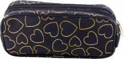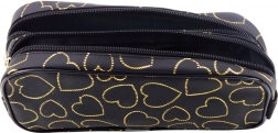 Elegante en functionele etui met een zwarte achtergrond, versierd met gouden hartjes. Ideaal voor studenten, met twee ruime compartimenten die helpen orde te houden in je schrijfwaren.