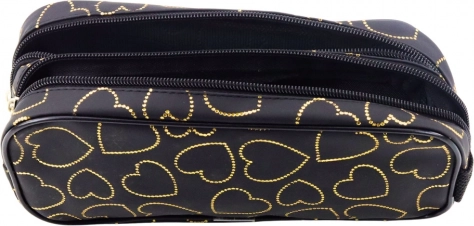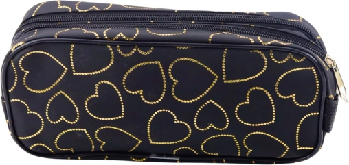 Gemaakt van duurzaam textielmateriaal met een subtiele glans, valt de etui op door de print van gouden hartjes op een diepzwarte achtergrond. Stevige ritsen zorgen voor veilige opslag van de inhoud. De zachte, flexibele constructie maakt het gemakkelijk om de etui in een rugzak of tas op te bergen zonder onnodige ruimte in te nemen.