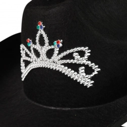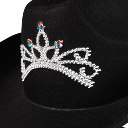 De elegante zwarte cowboyhoed is het perfecte accessoire voor alle liefhebsters van de westernstijl. Hij is voorzien van een opvallende zilveren kroon die de hoed extra aantrekkelijk maakt. De hoogte van de hoed is 14 cm, wat zorgt voor comfortabel draaggemak. De hoed is bedoeld voor volwassenen. Met deze hoed sta je altijd in het middelpunt van de aandacht, of het nu op een carnaval, een themafeest of een concert is.