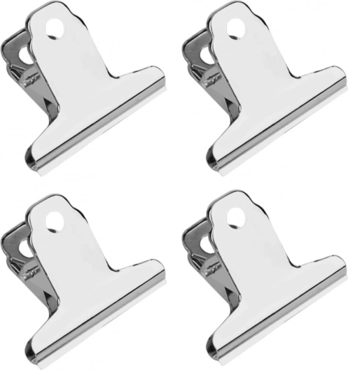 Deze clips zijn gemaakt van duurzaam metaal, wat hun langere levensduur en herhaald gebruik garandeert. Hun eenvoudige vorm en glanzende, verchroomde afwerking geven ze een professionele uitstraling. Dankzij het gat in de greep kun je de clips eenvoudig aan een bord of haak ophangen.