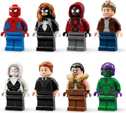 In de doos vind je 8 verzamelbare minifiguren – Spider-Man, Spider-Woman, Miles Morales (met motor), Eddie Brock, Ghost-Spider, Norman Osborn, Kraven de jager en de Groene Kabouter (met zweefvliegtuig). Dankzij de modulaire opzet bouw je de set eenvoudig om en creëer je je eigen actiestraten voor spel en display.