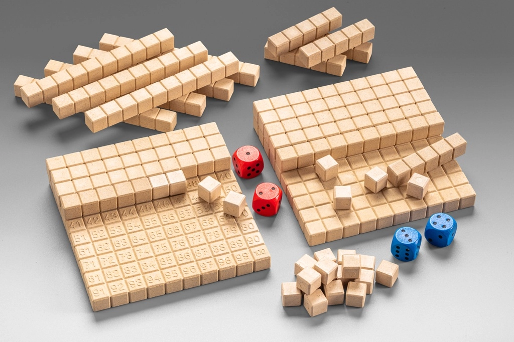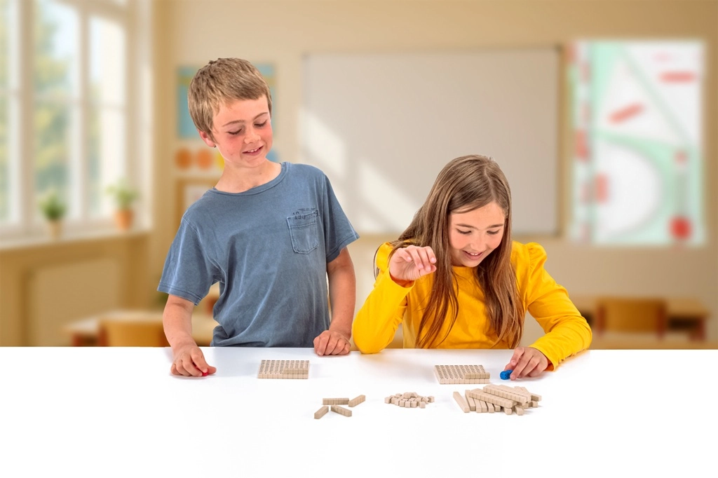 Inhoud van de verpakking: twee borden met cijfers, 22 staafjes van tien, 6 staafjes van vijf, 28 eenheidsblokjes, rode en blauwe blokken en een meertalige handleiding. Het spel is geschikt voor individueel en groepswerk.