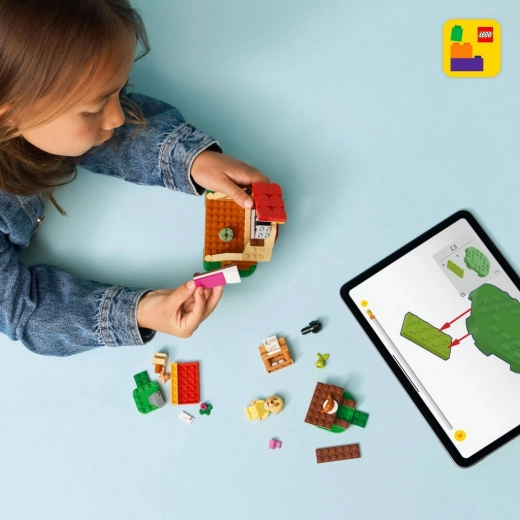 Bouw Goldies kleurrijke huisje met rood dak, brievenbus en een knus interieur met bed en piano. Buiten staat een picknicktafel met een croissant, peer en mok – perfect voor fantasierijke verhalen. Met de LEGO Builder-app kunnen kinderen modellen vergroten en in 3D draaien en zo met nog meer zelfvertrouwen bouwen.
