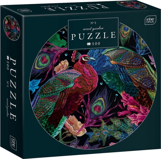 Ronde puzzel Secret Garden: Pauwenpaar met 500 stukjes voor een unieke puzzelervaring. Ideaal voor liefhebbers van prachtige illustraties.