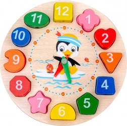 De klok heeft twee beweegbare wijzers en minutenmarkeringen, waarmee kinderen hele uren leren en hun tijdsbegrip verbeteren. Op de wijzerplaat staat een vrolijke pinguïn die ook de allerkleinsten aanspreekt.