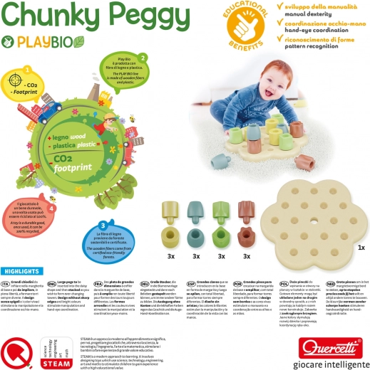 Het speelgoed PlayBio - Chunky Peggy is ideaal voor kleine kinderen dankzij de kleurrijke bouwelementen en het veilige ontwerp. Het is gemaakt van een biocomposiet materiaal dat helpt de CO2-uitstoot te verminderen.