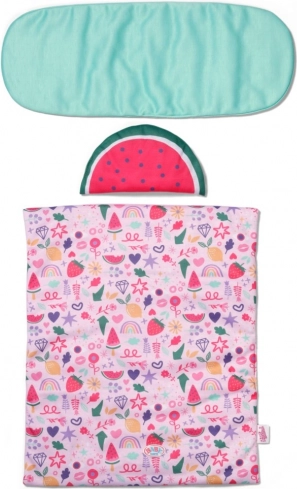 Een watermeloen-kussentje, een zachte matras/onderlegger en een kleurrijk dekentje met fruitmotieven zorgen voor comfort tijdens het rusten en in slaap wiegen.