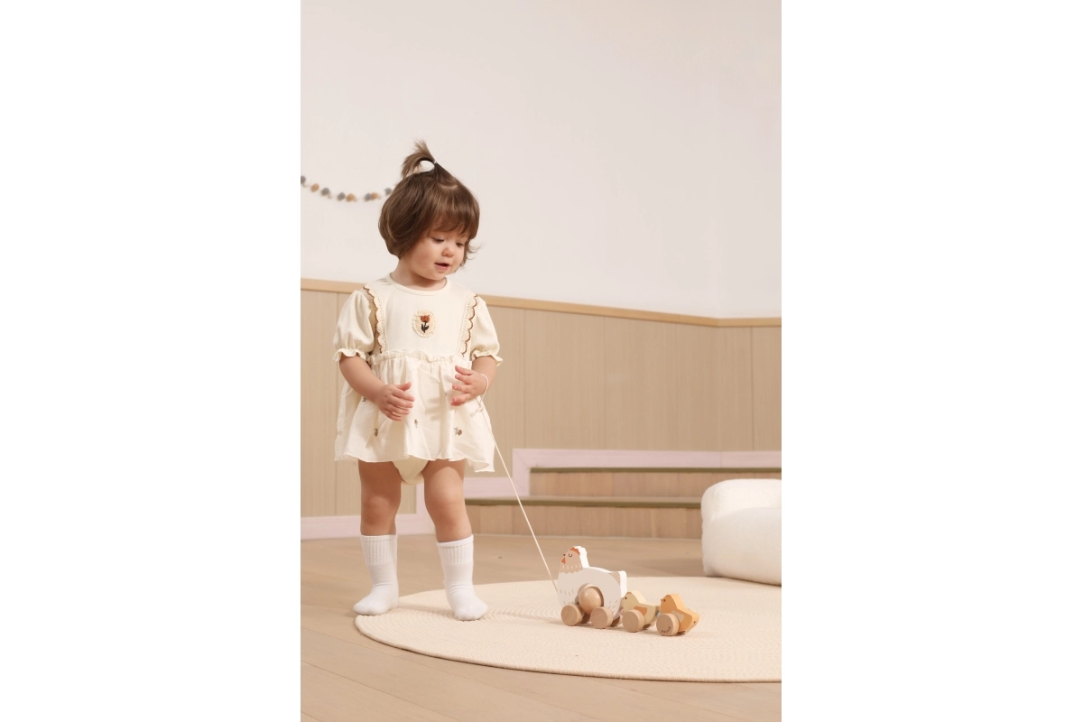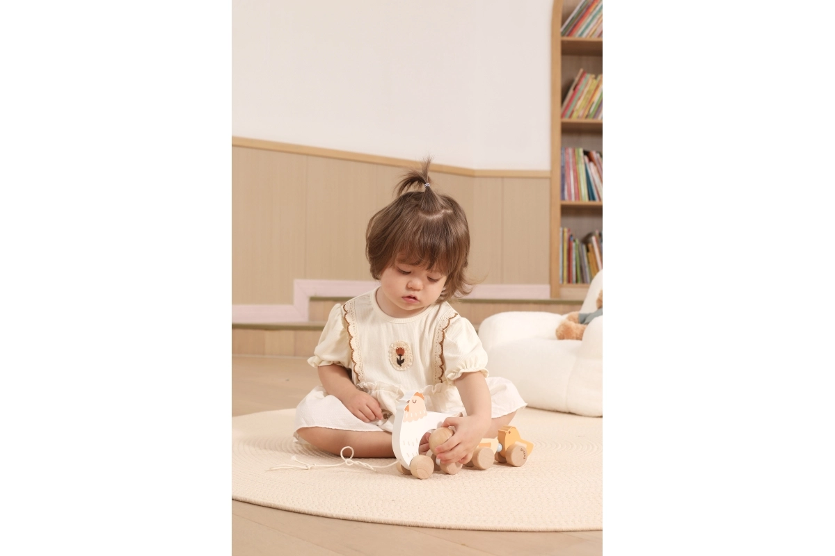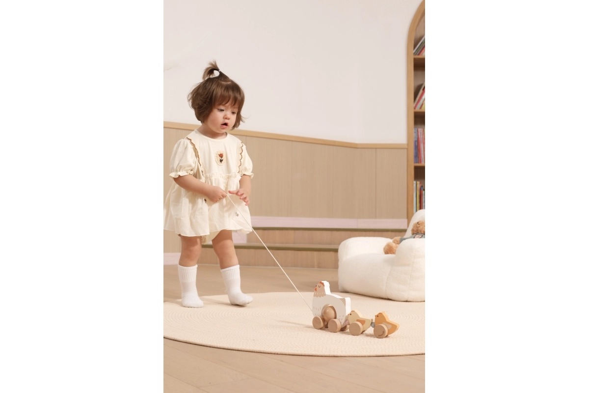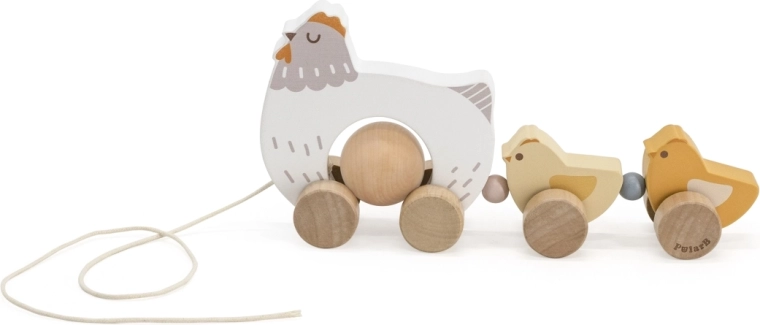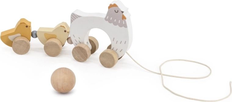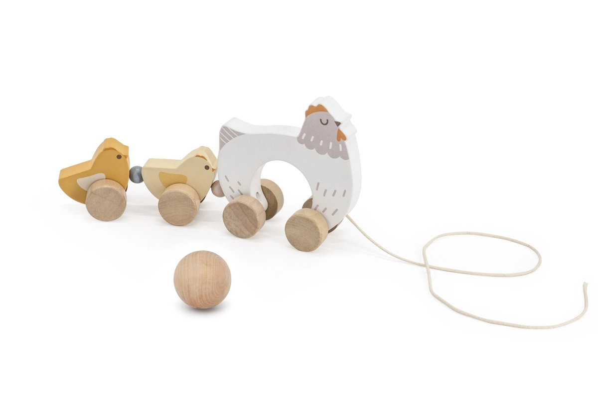 Het speelgoed is gemaakt van hoogwaardig hout met afgeronde randen voor veilig gebruik. Neutrale natuurlijke en pasteltinten passen perfect in een moderne kinderkamer. Dankzij de soepel rollende wieltjes en het touwtje trek je het hoentje met kuikentjes gemakkelijk over de vloer, waardoor het een stimulans is om te gaan lopen.