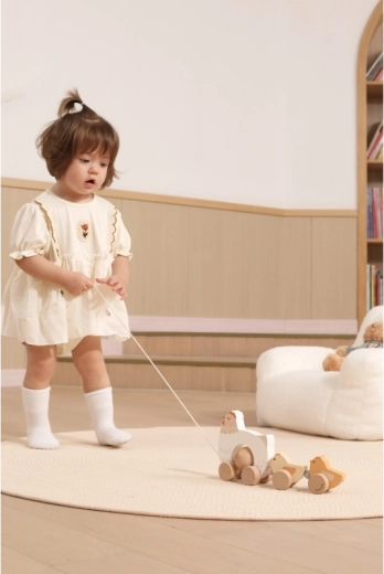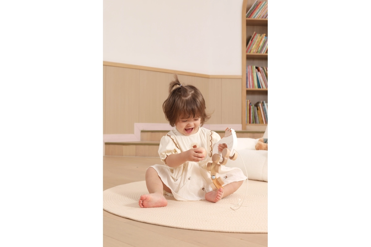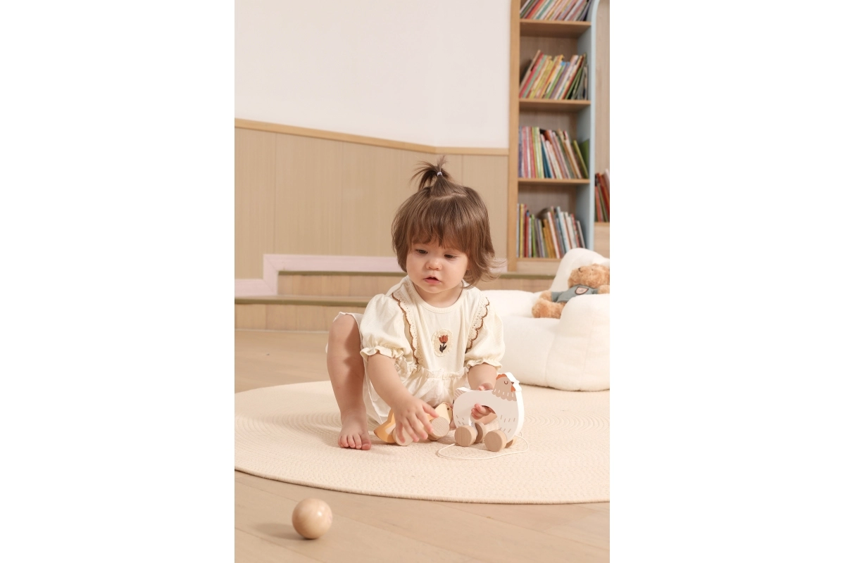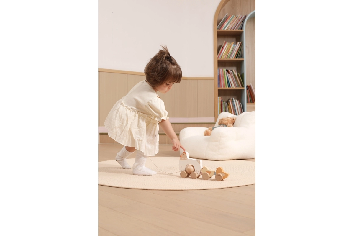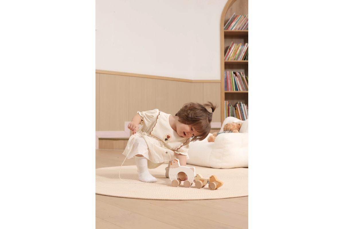 Bij het trekken bewegen de kuikentjes ritmisch mee en lokken kinderen uit tot nog meer stapjes – plezier en balansoefening in één.