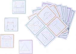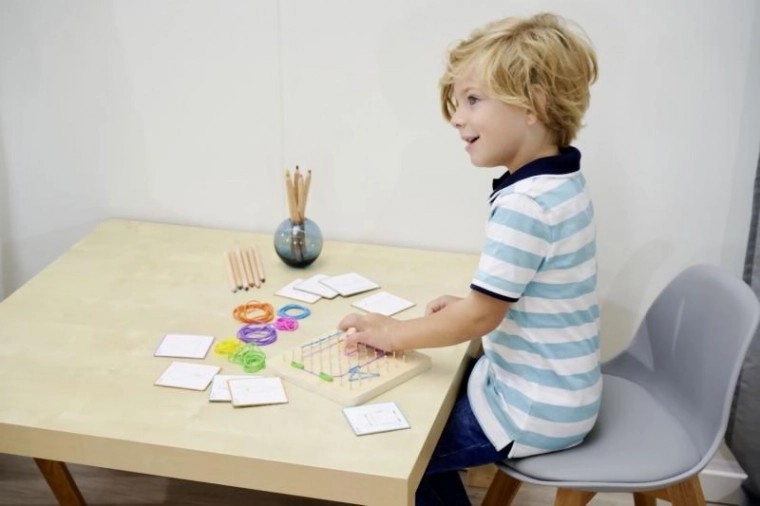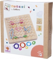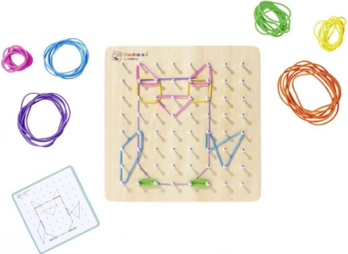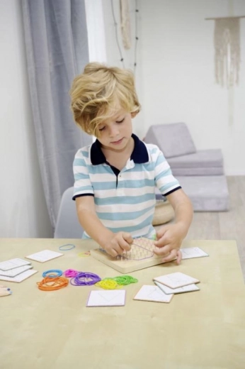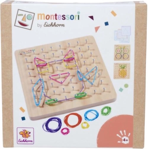Montessori geometrische plank is een ideale set voor de ontwikkeling van fijne motoriek en creativiteit bij kinderen. Met 64 pinnen en 60 gekleurde elastiekjes kunnen kinderen verschillende vormen en motieven maken met behulp van 24 opdrachtkaarten van uiteenlopende moeilijkheidsgraden.
