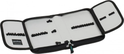 Uniek systeem met verwisselbare pins voor personalisatie, een ruime eenlagige etui met extra vakje en een zak voor schoenen of sport van stevig, afwasbaar materiaal.