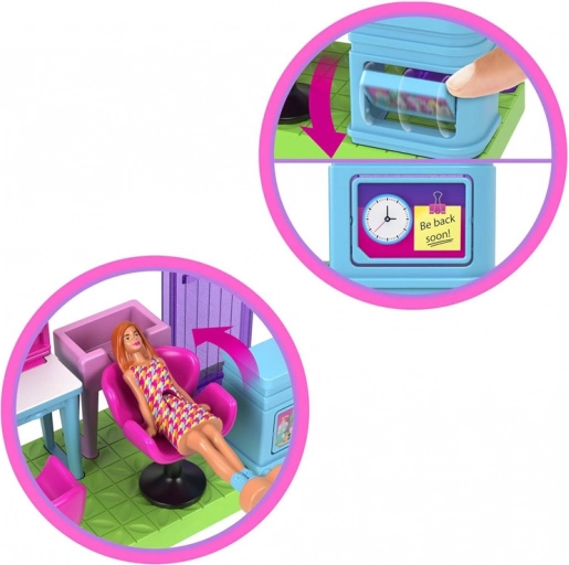 De set is aangevuld met interactieve elementen, zoals een verstelbare stoel en een draaibaar bord waarmee kinderen kunnen bepalen of de salon open of gesloten is. De mini Barbie-pop buigt in de taille, waardoor ze gemakkelijk op de stoel of bij de receptie geplaatst kan worden. Een extra voordeel is de hartvormige standaard, compatibel met andere Mini BarbieLand-sets.