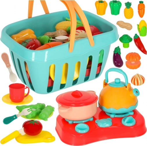 Dankzij het grote aantal onderdelen kunnen kinderen winkel, keukentje en restaurant spelen. Snijden, serveren en koken met het kannetje, de pan en de snijplank stimuleren de fantasie, communicatie en ondersteunen het aanleren van gezonde eetgewoonten.
