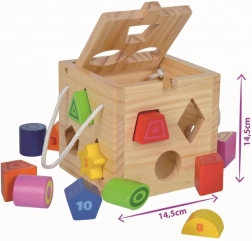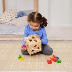 Deze houten, open te maken kubus biedt het klassieke spel van vormen herkennen. Kinderen plaatsen de afzonderlijke stukjes in de juiste openingen en oefenen oog-handcoördinatie, logisch denken en concentratie. Dankzij de heldere kleuren is leren vanzelf leuk.
