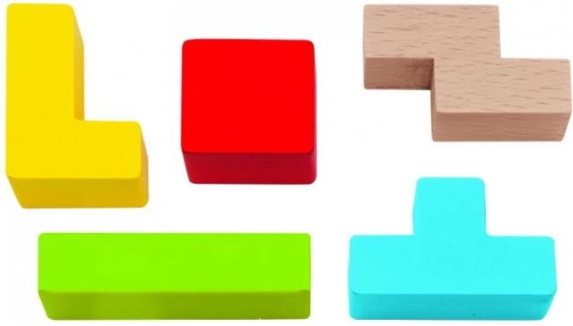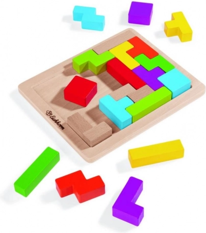 Slimme houten puzzel voor 1 speler die de fijne motoriek en het logisch denken stimuleert. Bevat 20 gekleurde blokken van beukenhout in 5 verschillende vormen en een stevige multiplexplaat van 18 × 15 cm voor nauwkeurig leggen van vormen.