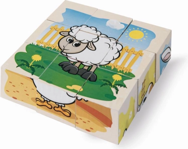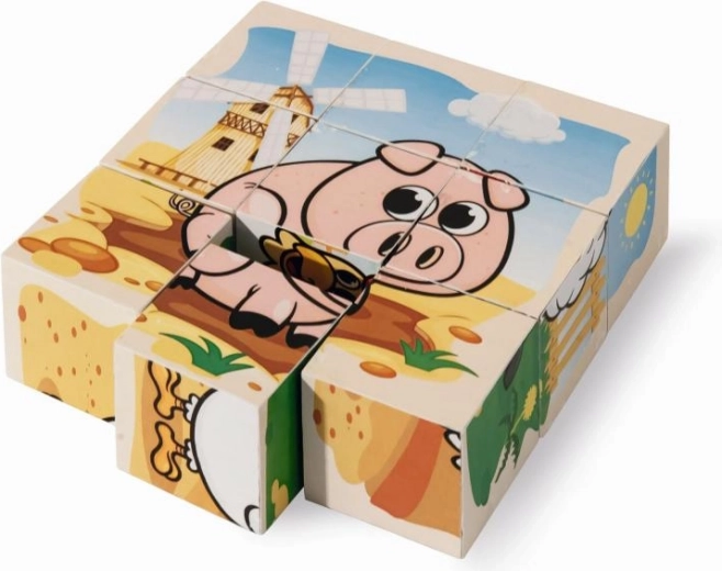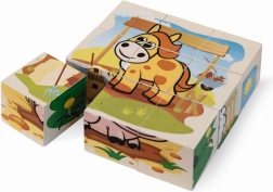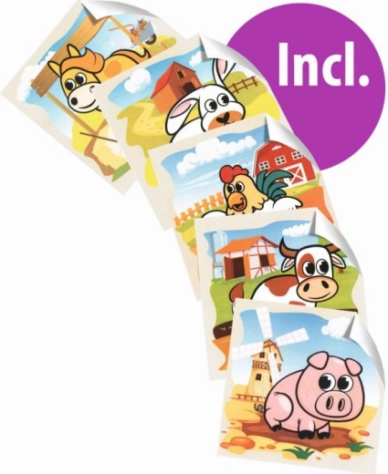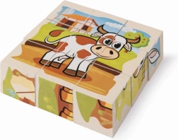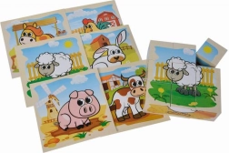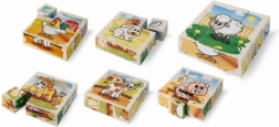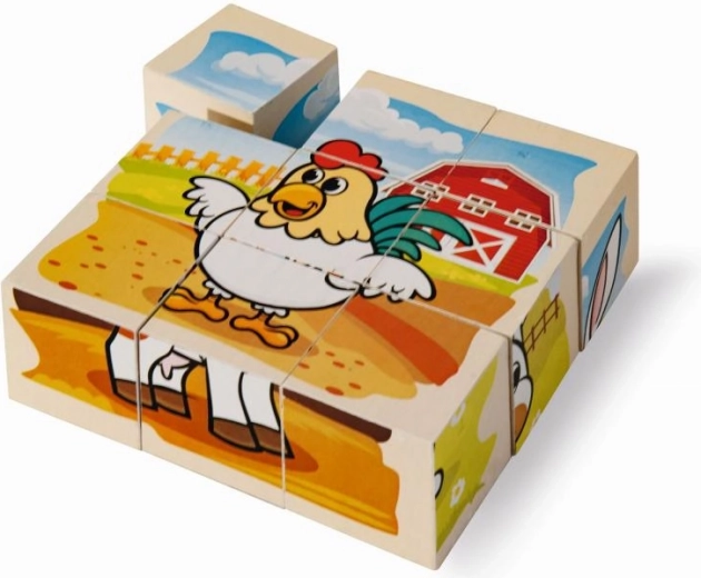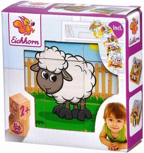 Stel zes schattige afbeeldingen met boerderijdieren samen uit negen houten blokken. De set biedt 6 motieven en 6 voorbeeldkaarten voor makkelijk puzzelen, is gemaakt van grenenhout met FSC-certificering en heeft opgebouwd een afmeting van 10,5 × 10,5 cm.