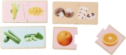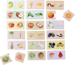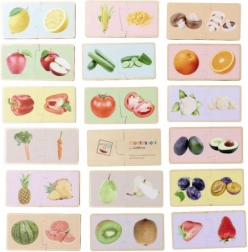 De houten Montessori-puzzels met het thema fruit en groenten leren kinderen identieke stukjes correct te koppelen en de verschillende voedingsmiddelen te benoemen. Realistische illustraties helpen het spel te verbinden met het dagelijks leven en ondersteunen natuurlijk leren door te spelen.