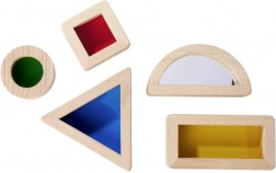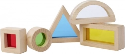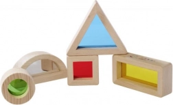 Blokken in verschillende vormen nodigen uit om te experimenteren met licht, kleuren en vormen. Kinderen kunnen de wereld door gekleurde lenzen bekijken, kleuren mengen of zichzelf ontdekken in het spiegeleffect. De zorgvuldige afwerking van stevig beukenhout zorgt voor een aangenaam gevoel en een lange levensduur.